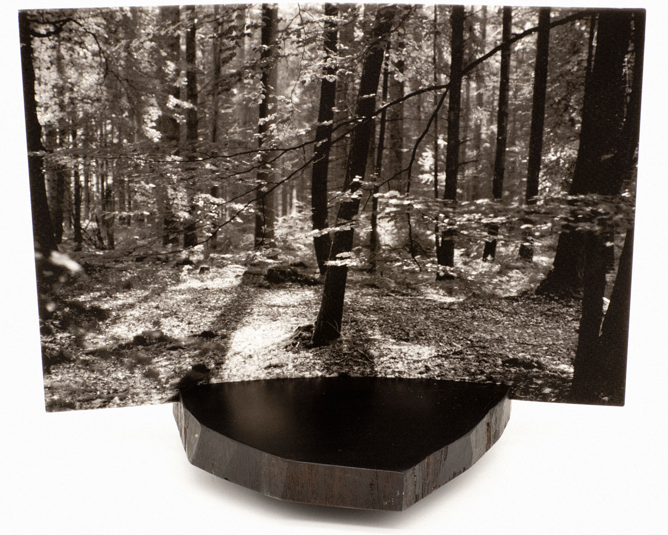 Een van de uitdagingen in het vervaardigen van de houten fotostandaard lag in de manier waarop de foto bevestigd zou moeten worden. Na veel experimenteren bleek een gefreesde sleuf in een curve de mooiste oplossing te zijn. De frees is ragfijn, smal en diep genoeg om het bijzondere papier te kunnen klemmen. De foto krijgt daardoor de curve mee, waardoor er een subtiel panorama-effect ontstaat. Het eeuwenoude Macasar ebbenhout uit Sri Lanka (Ceylon) bezit een zwarte en hazelnootbruine kleur, met bruine strepen en is erg zwaar en hard. Perfect om toe te passen als standaard vanwege het gewicht. De robuustheid van deze houtsoort levert een spannend contrast op met de fragiliteit van het papier dat vastgehouden wordt. Ook dat is Kuro-Shiro.